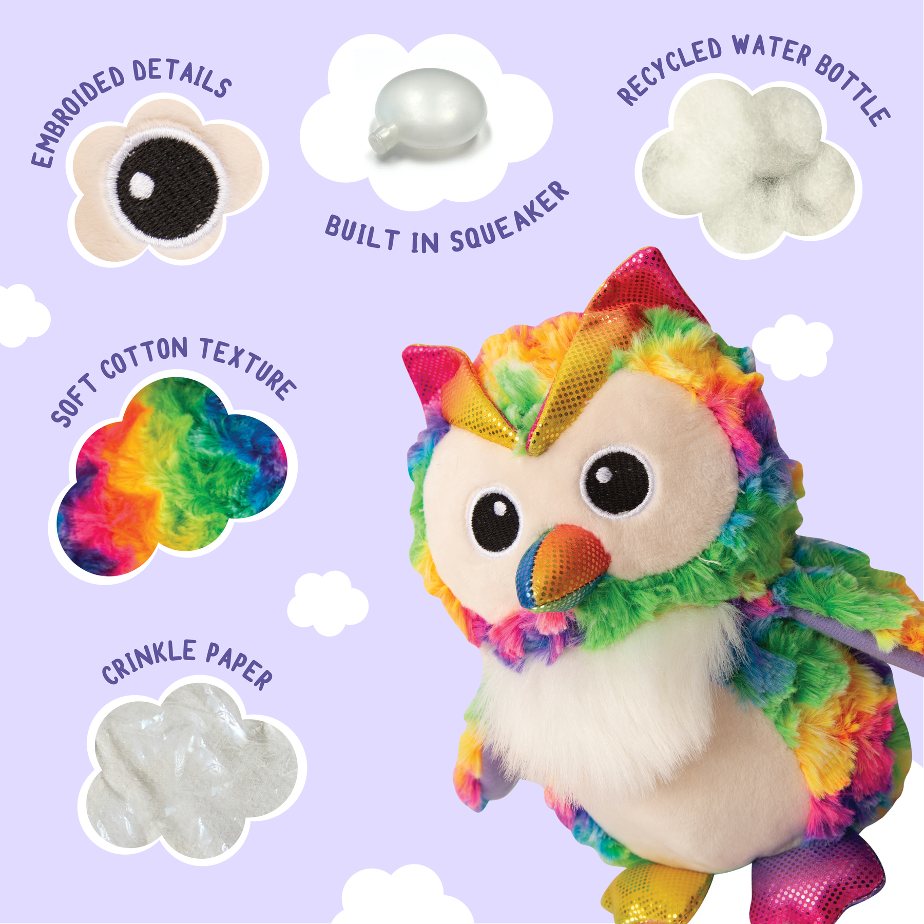 Multiple squeakers + crinkle material for engaging sound and texture