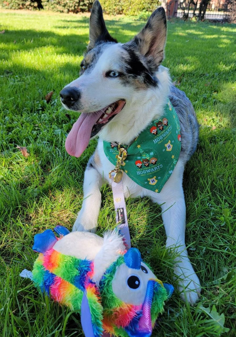 Rainbow feathers and sparkly accents for cute dog toy style