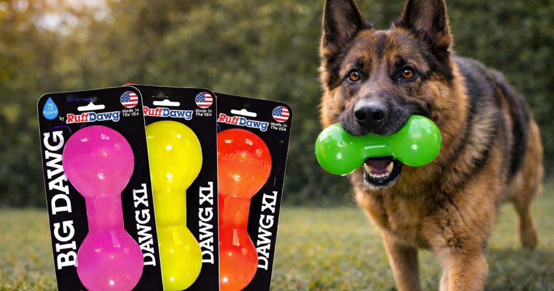 Ruff Dawg dog toys are USA-made from 100% FDA-approved, recyclable rubber—durable, safe, and perfect for fetch, chew, and water play.